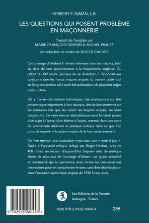 Cet ouvrage d’Herbert F. Inman intéresse tous les maçons, bien au delà de leur appartenance à la maçonnerie anglaise. Au début du XXe siècle, époque de sa rédaction, il répondait aux questions que les francs maçons anglais lui avaient posé tout au long des années où il avait été précepteur de plusieurs loges d’instruction. On y trouve des notices historiques, des explications sur des personnages importants à leur époque, des éclaircissements sur les symboles tels que les voient les maçons anglais, sur leurs usages, etc. Ce vade mecum alphabétique nous fait ainsi passer d’un sujet à l’autre, d’un thème à l’autre, comme dans une sorte de promenade aléatoire et presque ludique dans ce que l’on pourrait appeler « le jardin anglais de la franc-maçonnerie ». Ce livre méritait une traduction mais aussi une « mise à jour ». Grâce à l’appareil critique rédigé par Roger Dachez, près de 400 notes, un lecteur d’aujourd’hui dispose ainsi de quelque chose de plus que de l’ouvrage d’Inman : un guide actualisé et commenté qui lui permettra, avec toutes les connaissances nécessaires pour en comprendre le sens, une libre déambulation dans l’univers maçonnique anglais de 1930 à nos jours.