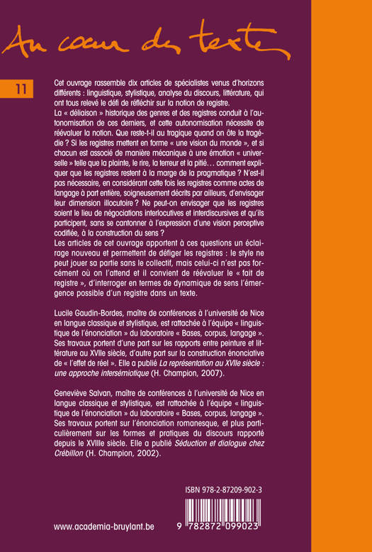 Les articles de cet ouvrage, écrits par des spécialistes d'horizons divers, apportent à la question des registres dits " littéraires " un éclairage nouveau. Les registres y sont considérés comme des actes de langage à part entière et envisagés dans leur dimension illocutoire. Chacun montre, sur un corpus précis, comment les registres, une fois " dé-figés " et dégagés d'une vision perceptive codifiée, participent à la construction du sens, à la dynamique du discours, voire à l'émergence du style.