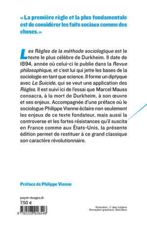 Les "Règles de la méthode sociologique" est le texte le plus célèbre de Durkheim. Il date de 1894, année où celui-ci le publie dans la "Revue philosophique", et c'est lui qui jette les bases de la sociologie en tant que science. Il forme un diptyque avec "Le Suicide", qui se veut une application des "Règles". Il est suivi ici de l'essai que Marcel Mauss consacra, à la mort de Durkheim, à son oeuvre et ses enjeux. Accompagnée d'une préface où le sociologue Philippe Vienne éclaire non seulement les enjeux de ce texte fondateur, mais aussi la controverse et les fortes résistances qu'il suscita en France comme aux Etats-Unis, la présente édition permet de restituer à ce grand classique son caractère révolutionnaire.