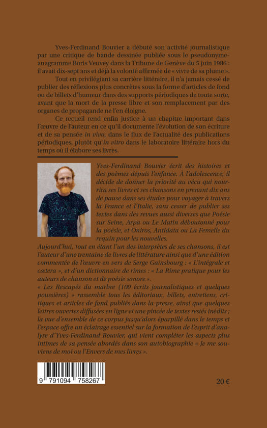 Yves-Ferdinand Bouvier a débuté son activité journalistique par une critique de bande dessinée publiée sous le pseudonyme-anagramme Boris Veuvey dans la Tribune de Genève du 5 juin 1986 : il avait dix-sept ans et déjà la volonté affirmée de «vivre de sa plume». Tout en privilégiant sa carrière littéraire, il n’a jamais cessé de publier des réflexions plus concrètes sous la forme d’articles de fond ou de billets d’humeur dans des supports périodiques de toute sorte, avant que la mort de la presse libre et son remplacement par des organes de propagande ne l’en éloigne. «Les Rescapés du marbre (100 écrits journalistiques et quelques poussières)» rassemble tous les éditoriaux, billets, entretiens, critiques et articles de fond publiés dans la presse, ainsi que quelques lettres ouvertes diffusées en ligne et une pincée de textes restés inédits ; la vue d’ensemble de ce corpus jusqu’alors éparpillé dans le temps et l’espace offre un éclairage essentiel sur la formation de l’esprit d’analyse d’Yves-Ferdinand Bouvier, qui vient compléter les aspects plus intimes de sa pensée abordés dans son autobiographie «Je me souviens de moi ou l’Envers de mes livres», et ce recueil rend enfin justice à un chapitre important dans l’œuvre de l’auteur en ce qu’il documente l’évolution de son écriture et de sa pensée in vivo, dans le flux de l’actualité des publications périodiques, plutôt qu’in vitro dans le laboratoire littéraire hors du temps où il élabore ses livres.