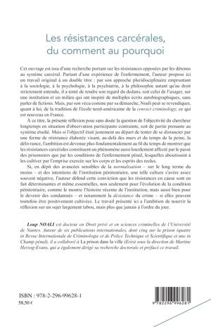 Cette recherche porte sur les résistances opposées par les détenus au système carcéral. Partant d'une expérience de l'enfermement, l'auteur propose une analyse pluridisciplinaire (droit, sociologie, psycholologie, psychiatrie, philosophie) tentant de rendre son regard d'usager sur cette institution et son milieu. Il est convaincu que les résistances sont déterminantes et essentielles pour l'évolution de la condition pénitentiaire et le devenir des condamnés.