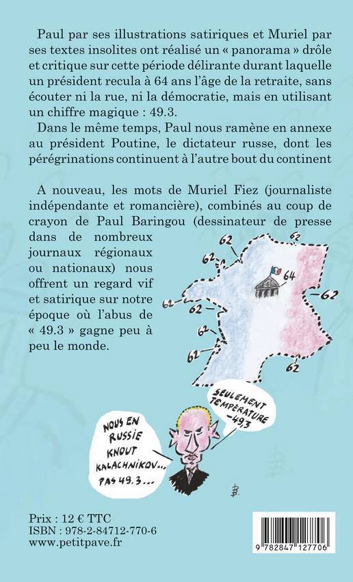 Paul par ses illustrations satiriques et Muriel par ses textes insolites ont réalisé un « panorama » drôle et critique sur cette période délirante durant laquelle un président recula à 64 ans l’âge de la retraite, sans écouter ni la rue, ni la démocratie, mais en utilisant un chiffre magique : 49.3. Dans le même temps, Paul nous ramène en annexe au président Poutine, le dictateur russe, dont les pérégrinations continuent à l’autre bout du continent.