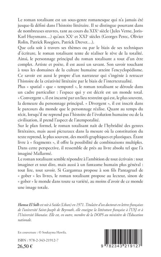 Le roman totalisant est un sous-genre romanesque qui n'a jamais été jusque-là défini dans l'histoire littéraire. Il se distingue pourtant dans de nombreuses oeuvres, tant au cours du XIXe siècle (Jules Verne, Joris-Karl Huysmans...) qu'aux XXe et XXIe siècles (Georges Perec, Olivier Rolin, Patrick Roegiers, Patrick Drevet...). Que cela soit à travers ses thèmes ou par le biais de ses techniques d'écriture, le roman totalisant tente de réaliser le rêve de la totalité. Dans cette perspective, il ressemble de près au livre absolu tel que l'a imaginé Mallarmé. Le roman totalisant semble répondre à l'ambition de tout écrivain: tout imaginer et tout dire, mais aussi à un fantasme humain plus général: tout lire, tout savoir. Si Gargantua propose à son fils Pantagruel de gober les livres, le roman totalisant propose au lecteur, sinon de gober le monde dans toute sa variété, au moins d'avoir de ce monde une image totale.