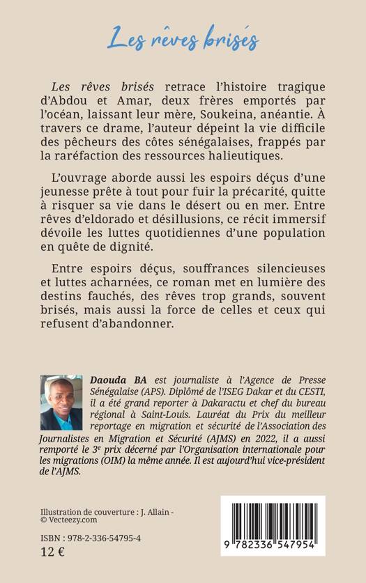 Les Rêves brisés retrace l'histoire tragique d'Abdou et Amar, deux frères emportés par l'océan, laissant leur mère, Soukeina, anéantie. À travers ce drame, l'auteur dépeint la vie difficile des pêcheurs des côtes sénégalaises, frappés par la raréfaction des ressources halieutiques. L'ouvrage aborde aussi les espoirs déçus d'une jeunesse prête à tout pour fuir la précarité, quitte à risquer sa vie dans le désert ou en mer. Entre rêves d'eldorado et désillusions, ce récit immersif dévoile les luttes quotidiennes d'une population en quête de dignité. Entre espoirs déçus, souffrances silencieuses et luttes acharnées, ce roman met en lumière des destins fauchés, des rêves trop grands, souvent brisés, mais aussi la force de celles et ceux qui refusent d'abandonner.