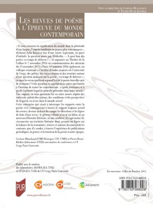 Cette entreprise qui visait à interroger les rapports entre la poésie et le contemporain à travers le support toujours actuel des revues, dessine au bout du compte les directions et les lignes de fuite d’une revue : le présent volume n’est ni un bilan, ni un morceau d’histoire littéraire, ni une synthèse ; il s’agit moins d’y circonscrire un territoire littéraire dont, pesants ou légers sur la balance de la renommée, oeuvres et auteurs dessineraient les contours, que d’y sonder, à travers l’expérience de publications périodiques, la genèse et la fonction de la poésie à notre époque.