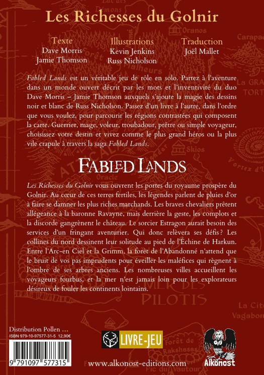 Fabled Lands est un véritable jeu de rôle en solo dans un monde totalement ouvert. Passez d’un livre à l’autre, dans l’ordre que vous voulez, pour parcourir les régions contrastées qui composent la carte. Guerrier, mage, voleur, troubadour, prêtre ou simple voyageur, choisissez votre destin et vivez comme le plus grand héros ou la plus vile crapule. Au fil des quêtes et de vos explorations, faites-vous des alliés et des ennemis, découvrez des lieux merveilleux, devenez plus fort, obtenez du matériel, achetez un navire, un équipage et même une maison, offrez-vous la bénédiction d’un dieu ou reniez-le pour un autre et parcourez les terres fabuleuses en toute liberté dans cette série de livres-jeux d’une richesse inédite.