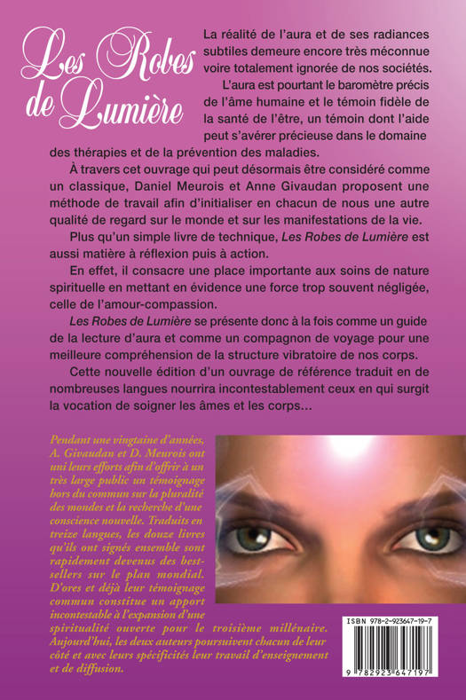 La réalité de l'aura et de ses radiances subtiles demeure encore très méconnue voire totalement ignorée de nos sociétés. L'aura est pourtant le baromètre précis de l'âme humaine et le témoin fidèle de la santé de l'être, un témoin dont l'aide peut s'avérer précieuse dans le domaine des thérapies et de la prévention des maladies. À travers cet ouvrage qui peut désormais être considéré comme un classique, Daniel Meurois et Anne Givaudan proposent une méthode de travail afin d'initialiser en chacun de nous une autre qualité de regard sur le monde et sur les manifestations de la vie. Plus qu'un simple livre de technique, ''Les Robes de Lumière'' est aussi matière à réflexion puis à action. En effet, il consacre une place importante aux soins de nature spirituelle en mettant en évidence une force trop souvent négligée, celle de l'amour-compassion. ''Les Robes de Lumière'' se présente donc à la fois comme un guide de la lecture d'aura et comme un compagnon de voyage pour une meilleure compréhension de la structure vibratoire de nos corps. Cette nouvelle édition d'un ouvrage de référence traduit en de nombreuses langues nourrira incontestablement ceux en qui surgit la vocation de soigner les âmes et les corps… Remplace réf 10221 - EAN 9782922397154