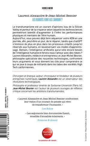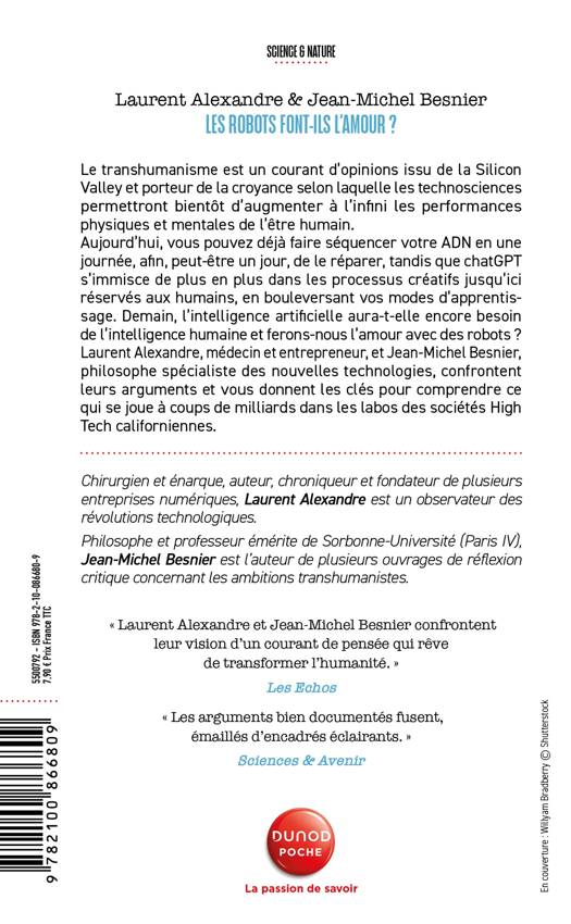 Le transhumanisme est un mouvement technico-scientifique international qui prétend augmenter à l'infini les performances physiques et mentales de l'être humain. Aujourd'hui vous pouvez déjà faire séquencer votre ADN en une journée, pour, peut-être un jour, le réparer, tandis qu'Internet bouleverse nos modes d'apprentissage et nos relations sociales. Demain, l'intelligence artificielle aura-t-elle encore besoin de l'intelligence humaine et ferons-nous l'amour avec des robots? Laurent Alexandre, Médecin et entrepreneur, et Jean-Michel Besnier, philosophe spécialiste des nouvelles technologies, confrontent leurs arguments et vous donnent les clés pour comprendre ce qui se joue à coups de milliards dans les labos des sociétés High Tech californiennes.