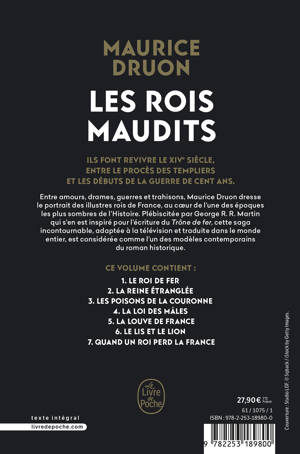 Entre amours, drames, guerres et trahisons, Maurice Druon dresse le portrait dense et intime de ces illustres figures, au cœur de l’une des époques les plus sombres de l’Histoire. Plébiscitée par George R. R. Martin qui s’en est inspiré pour l’écriture du Trône de fer, cette saga incontournable, adaptée à la télévision et traduite dans le monde entier, est considérée comme un des modèles contemporains du roman historique.