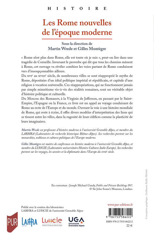 Du XVIe au XVIIIe siècle, de nombreuses villes se sont réapproprié le mythe de Rome, dépositaire d'un idéal politique impérial et républicain, et capitale d'une religion à vocation universelle. Ces réappropriations, qui ne fonctionnent jamais par simple mimétisme vis-à-vis des réalités romaines, sont un véritable objet d'histoire politique et culturelle.