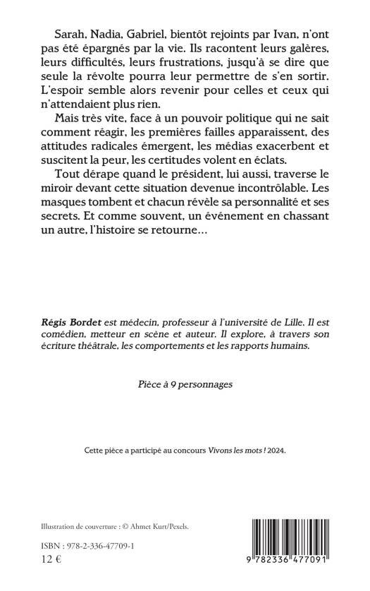 Sarah, Nadia, Gabriel, bientôt rejoints par Ivan, n'ont pas été épargnés par la vie. Ils racontent leurs galères, leurs difficultés, leurs frustrations, jusqu'à se dire que seule la révolte pourra leur permettre de s'en sortir. L'espoir semble alors revenir pour celles et ceux qui n'attendaient plus rien. Mais très vite, face à un pouvoir politique qui ne sait comment réagir, les premières failles apparaissent, des attitudes radicales émergent, les médias exacerbent et suscitent la peur, les certitudes volent en éclats. Tout dérape quand le président, lui aussi, traverse le miroir devant cette situation devenue incontrôlable. Les masques tombent et chacun révèle sa personnalité et ses secrets. Et comme souvent, un événement en chassant un autre, l'histoire se retourne...