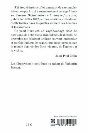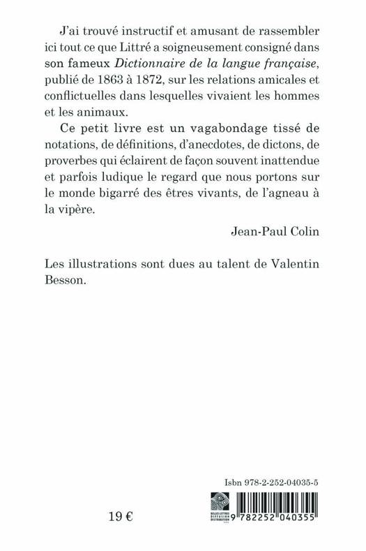 J'ai trouve instructif et amusant de rassembler ici tout ce que Littre a soigneusement consigne dans son fameux Dictionnaire de la langue francaise, publie de 1863 a 1872, sur les relations amicales et conflictuelles dans lesquelles vivaient les hommes et les animaux.Ce petit livre est un vagabondage tisse de notations, de definitions, d'anecdotes, de dictons, de proverbes qui eclairent de facon souvent inattendue et parfois ludique le regard que nous portons sur le monde bigarre des etres vivants, de l'agneau a la vipere.Jean-Paul Colin