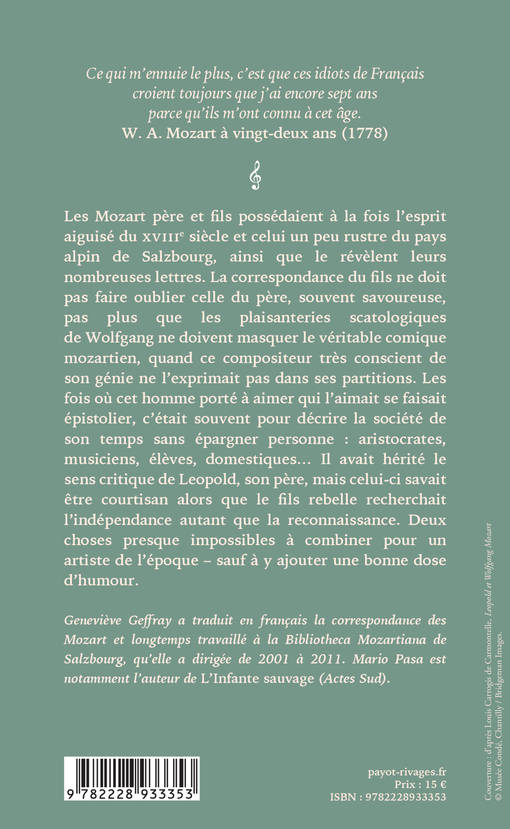 On parle toujours de l'abondante correspondance de Wolfgang Amadeus Mozart en oubliant celle de Leopold, ce père si important dans l'épanouissement de son talent. On parle toujours des plaisanteries scatologiques du fils en oubliant son véritable humour, celui d'un artiste très conscient de sa supériorité : il l'exerçait pour peindre la société de son temps (aristocrates, musiciens, élèves...) ou pour décrire les inconvénients des voyages, comme le faisait aussi Leopold. Ce sont là autant de sautes d'humour vachardes sur les ridicules du XVIIIe siècle. Elles se savourent comme un opéra bouffe et nous offrent une approche biographique originale sur un génie qui n'a pas fini de nous étonner.