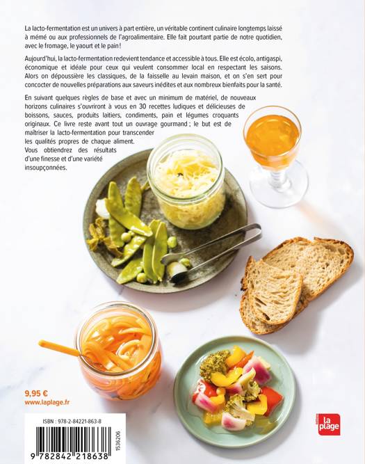La lacto-fermentation est un univers à part entière, un véritable continent culinaire longtemps laissé à mémé ou aux professionnels de l’agroalimentaire. Elle fait pourtant partie de notre quotidien, avec le fromage, le yaourt et le pain ! Aujourd’hui, la lacto-fermentation redevient tendance et accessible à tous. Elle est écolo, antigaspi, économique et idéale pour ceux qui veulent consommer local en respectant les saisons. Alors on dépoussière les classiques, de la faisselle au levain maison, et on s’en sert pour concocter de nouvelles préparations aux saveurs inédites et aux nombreux bienfaits pour la santé. En suivant quelques règles de base et avec un minimum de matériel, de nouveaux horizons culinaires s’ouvriront à vous en 30 recettes ludiques et délicieuses de boissons, sauces, produits laitiers, condiments, pain et légumes croquants originaux. Ce livre reste avant tout un ouvrage gourmand ; le but est de maîtriser la lacto-fermentation pour transcender les qualités propres de chaque aliment. Vous obtiendrez des résultats d’une finesse et d’une variété insoupçonnées