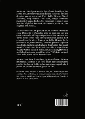 Le secret, lénigme et le mystère sont de véritables dissonances du savoir, des déviations de la connaissance pure puisque en tout état de cause, ces concepts se refusent à apparaître tels quils sont. En partant de ce constat simple, lauteur, libre de toutes contraintes, sest donc autorisé à porter un jugement, un regard sur ces mystères de lart au XXe siècle. Le parti-pris aura été ici de prendre les thèmes les plus en phase avec les questionnements propres de lauteur. Picasso, Duchamp, Warhol, Yves Klein, Marinetti, Jeanne Bucher, des noms connus, des histoires répétées. Pourtant, des secrets persistent, des énigmes demeurent...