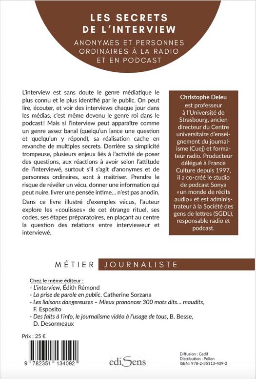 Si l’interview peut apparaître comme un genre assez banal (quelqu’un lance une question et quelqu’un y répond), sa réalisation cache en revanche de multiples aspects dont l’analyse s’avère passionnante. Derrière la simplicité trompeuse de son dispositif il est nécessaire de s’attarder sur plusieurs enjeux liés à l’activité de poser des questions, pour tenter de percer les secrets d’un genre qui s’avère en réalité assez mystérieux. L’interview est sans doute le genre médiatique le plus connu, et le plus identifié par le public. Chacun et chacune sait ce qu’est une interview. Et on peut lire, écouter, et voir des interviews chaque jour dans la plupart des médias. L’interview est même devenu le genre roi dans le podcast, qui s’est imposé en France durant ces dix dernières années... Comment expliquer alors qu’il existe si peu d’ouvrages sur l’interview dans les médias ? L’interview est pourtant un genre ancien, dont l’histoire remonte à la fin du XIXème siècle (comme le reportage), quand la presse se démocratise et se popularise. Dans les écoles de journalisme, l’interview n’est en règle générale que très peu étudiée. Des conseils sont certes prodigués aux étudiants, mais les pédagogues considèrent souvent qu’il est difficile d’isoler l’interview dans un cours qui lui serait spécifiquement dédié. Chaque interview est une situation particulière, peut-on souvent entendre, en guise d’avertissement. Dès lors, comment des techniques d’interview pourraient-elles s’enseigner et être modélisées? Ne risquerait-on pas de rendre « mécanique » une relation avant tout interpersonnelle entre l’intervieweur et l’interviewé? N’étoufferait-on pas les instincts des intervieweurs en imposant des grilles d’entretien trop contraignantes ? L’auteur propose, pour cela, d’aller au-delà de la « familiarité » de l’interview, de cette idée selon laquelle l’interview ne serait qu’un contenu, le fruit de cet échange qui se donnerait à lire, entendre et voir de manière transparente, comme en surface. Il suffit de remonter aux débuts de son histoire pour constater que l’interview n’avait justement rien d’une évidence. Il a longtemps été interdit, pour les journalistes, d’interviewer les personnes plus puissantes de notre société, de la sphère politique et de la sphère religieuse. C’est donc bien la preuve que l’interview, à l’origine, n’allait pas de soi, et n’était une situation sociale ni admise, ni tolérée, et qu’il y avait bien un risque de se mettre dans la situation de répondre à des questions, et de livrer des informations au plus grand nombre, quelle que soit la nature de celles-ci. D’une manière ou d’une autre, l’interview a toujours eu à voir avec le secret. Répondre à une question, c’est partager une expérience, mais c’est aussi prendre le risque de révéler un vécu, ou (et) de donner une information qui peut nuire (à soi-même ou à d’autres), de changer le cours de l’Histoire, de livrer une pensée intime... Jouer le jeu de l’interview est rarement une pratique anodine... L’auteur propose donc de s’interroger sur les caractéristiques de l’interview. S’associant à celles et ceux qui ne veulent pas réduire l’interview à une simple opération technique, mais pas à celles et ceux qui rejettent toute tentative de modéliser le genre et toute approche réflexive sur le métier d’interviewer, il souhaite explorer les « coulisses » de l’interview, c’est-à-dire enquêter sur cet étrange rituel, ses codes, ses étapes préparatoires, en plaçant au centre de l’ouvrage la question des relations entre intervieweur et interviewé... L’auteur choisit de privilégier un certain type d’interviews, celui des anonymes, ou personnes ordinaires, ou lambda à la radio, ou pour le podcast. Celles et ceux qui ne sont pas des représentants, ni des experts. Dans ces interviews, les anonymes parlent en leur nom propre, se racontent, partagent des expériences personnelles, des ressentis, des émotions.