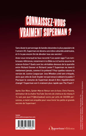 Aviez-vous remarqué les faux raccords ? Les easter eggs ? Les nombreuses références, notamment à la Bible ou à d’autres œuvres de science-fiction ? Quels sont les véritables dessous de la querelle entre Richard Donner et Richard Lester ? Superman ne ment-il réellement jamais, comme il le prétend ? Pour quelles raisons la version de Justice League par Joss Whedon a été tant critiquée, alors que celle de Zack Snyder est parvenue à séduire le public ? Pourquoi le costume de Superman devait-il être régulièrement changé ? Superman est-il vraiment plus rapide que The Flash ?