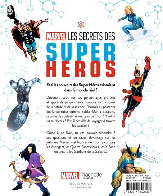 Dès 7 ans. Résumé : Et si les pouvoirs des Super Héros existaient dans le monde réel ? Découvre tout sur tes personnages préférés et apprends en quoi leurs pouvoirs sont inspirés de la nature et de la science. Pourrais-tu posséder des lance-toiles comme Spider-Man ? Serais-tu capable de soulever le marteau de Thor ? Y a-t-il un multivers ? Est-il possible de voyager à travers les galaxies ? Grâce à ce livre, tu vas pouvoir répondre à ces questions et en savoir davantage sur les justiciers Marvel – et leurs ennemies –, y compris les Avengers, les Quatre Fantastiques, les X-Men ou encore les Gardiens de la Galaxie…