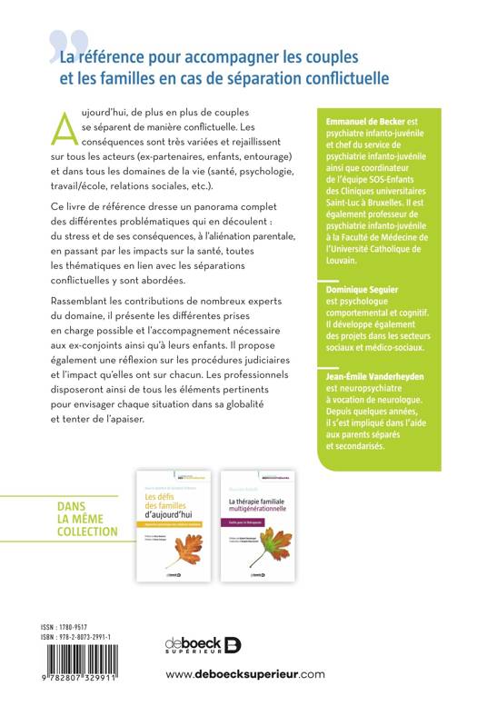 Ce livre de référence dresse un panorama complet des différentes problématiques qui en découlent : du stress et de ses conséquences, à l'aliénation parentale, en passant par les difficultés financières, etc. Rassemblant les contributions de nombreux experts du domaine, il présente les différentes prises en charge possibles et l'accompagnement nécessaire aux ex-conjoints et à leurs enfants. Il propose également une réflexion sur les procédures judiciaires et l'impact qu'elles ont sur chacun. Les professionnels disposeront ainsi de tous les éléments nécessaires utiles pour envisager du mieux possible chaque situation et tenter de l'apaiser.