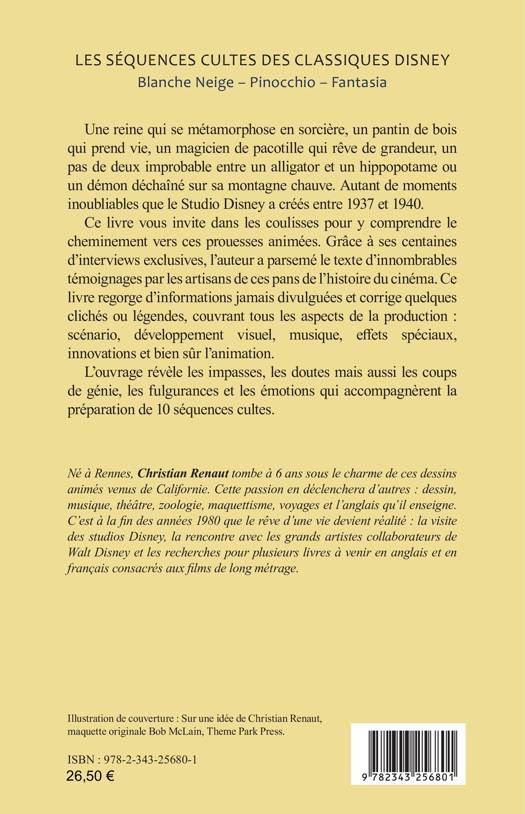 Une reine qui se métamorphose en sorcière, un pantin de bois qui prend vie, un magicien de pacotille qui rêve de grandeur, un pas de deux improbable entre un alligator et un hippopotame ou un démon déchaîné sur sa montagne chauve. Autant de moments inoubliables que le Studio Disney a créés entre 1937 et 1940. Ce livre vous invite dans les coulisses pour y comprendre le cheminement vers ces prouesses animées. Grâce à ses centaines d’interviews exclusives, l’auteur a parsemé le texte d’innombrables témoignages par les artisans de ces pans de l’histoire du cinéma. Ce livre regorge d’informations jamais divulguées et corrige quelques clichés ou légendes, couvrant tous les aspects de la production : scénario, développement visuel, musique, effets spéciaux, innovations et bien sûr l’animation.