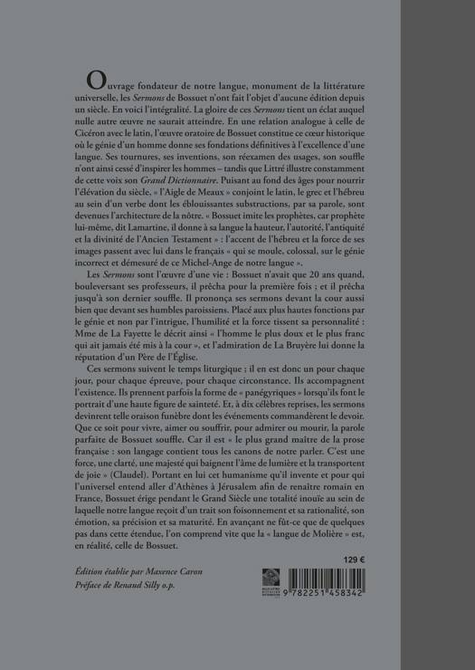 Ouvrage fondateur de notre langue, monument de la littérature universelle, les Sermons de Bossuet n’ont fait l’objet d’aucune édition depuis un siècle. En voici l’intégralité. La gloire de ces Sermons tient un éclat auquel nulle autre oeuvre ne saurait atteindre. En une relation analogue à celle de Cicéron avec le latin, l’oeuvre oratoire de Bossuet constitue ce coeur historique où le génie d’un homme donne ses fondations définitives à l’excellence d’une langue. Ses tournures, ses inventions, son réexamen des usages, son souffle n’ont ainsi cessé d’inspirer les hommes – tandis que Littré illustre constamment de cette voix son Grand Dictionnaire. Puisant au fond des âges pour nourrir l’élévation du siècle, « l’Aigle de Meaux » conjoint le latin, le grec et l’hébreu au sein d’un verbe dont les éblouissantes substructions, par sa parole, sont devenues l’architecture de la nôtre. « Bossuet imite les prophètes, car prophète lui-même, dit Lamartine, il donne à sa langue la hauteur, l’autorité, l’antiquité et la divinité de l’Ancien Testament » : l’accent de l’hébreu et la force de ses images passent avec lui dans le français « qui se moule, colossal, sur le génie incorrect et démesuré de ce Michel-Ange de notre langue ».