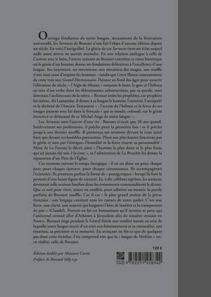 Les Sermons sont l’oeuvre d’une vie : Bossuet n’avait que 20 ans quand, bouleversant ses professeurs, il prêcha pour la première fois ; et il prêcha jusqu’à son dernier souffle. Il prononça ses sermons devant la cour aussi bien que devant ses humbles paroissiens. Placé aux plus hautes fonctions par le génie et non par l’intrigue, l’humilité et la force tissent sa personnalité : Mme de La Fayette le décrit ainsi « l’homme le plus doux et le plus franc qui ait jamais été mis à la cour », et l’admiration de La Bruyère lui donne la réputation d’un Père de l’Église.