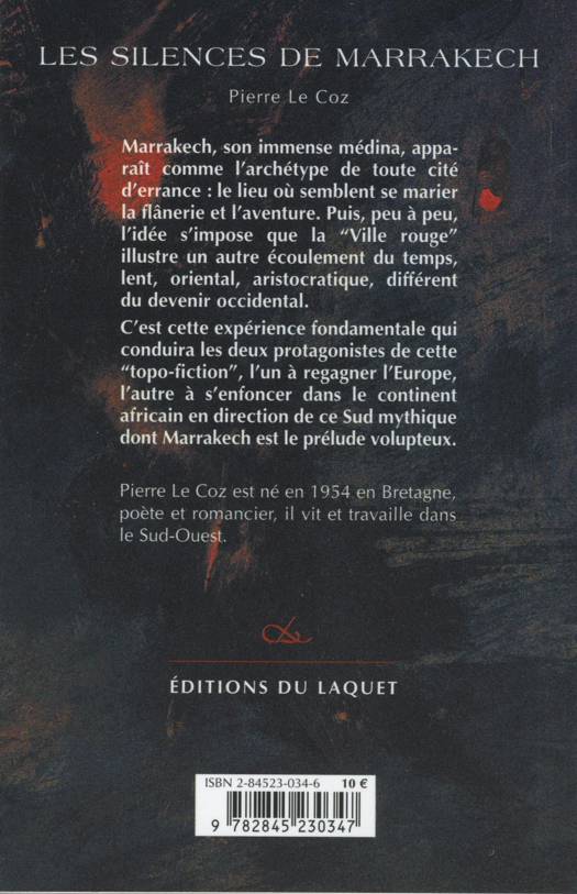 Marrakech, son immense médina, apparaît comme l'archétype de toute cité d'errance : le lieu où semblent se marier la flânerie et l'aventure. Puis, peu à peu, l'idée s'impose que la "Ville rouge" illustre un autre écoulement du temps, lent, oriental, aristocratique, différent du devenir occidental.