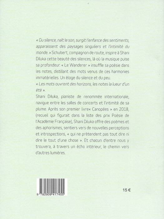 Shani Diluka, pianiste de renommée internationale, navigue entre les salles de concerts et l’intimité de sa plume.<br /> Schubert devenu son compagnon de route, lui apprend la beauté des silences, là où la musique puise sa profondeur : du silence naît le son, surgit l’enfance des sentiments, apparaissent des paysages singuliers et l’intimité du monde.<br /> Après son premier livre « Canopées » en 2018, (recueil qui figurait dans la liste des prix Poésie de l’Académie Française), Shani Diluka offre des poèmes et des aphorismes, sentiers vers de nouvelles perceptions et introspections, qui ne prétendent « pas tout dire ni dire le tout d’une chose ». Et chacun d’entre nous y trouvera le chemin vers d’autres lumières à travers un écho intérieur.<br /> Les dessins Jean Fléaca ponctuent ces pensées avec art et poésie, nous entrainant dans son monde de rêve,