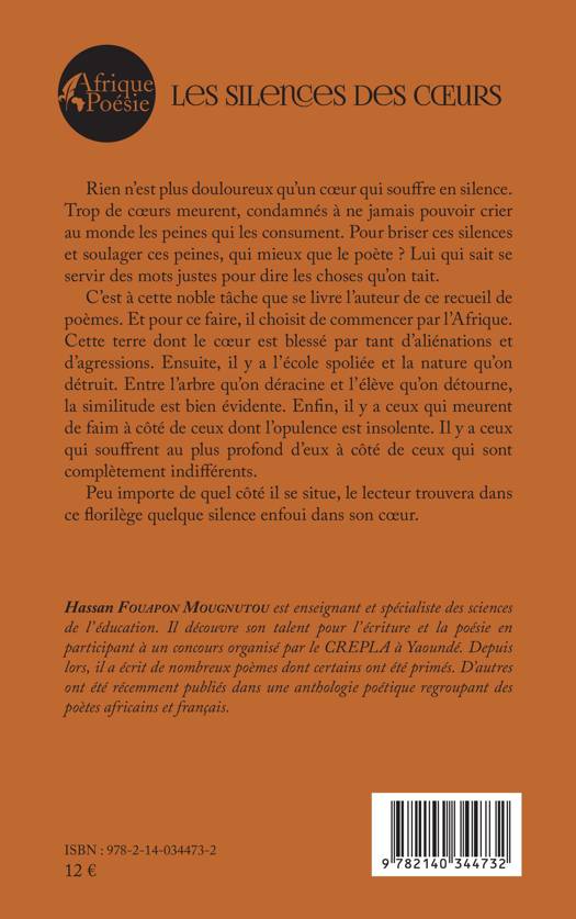 Rien n'est plus douloureux qu'un coeur qui souffre en silence. Trop de coeurs meurent, condamnés à ne jamais pouvoir crier au monde les peines qui les consument. Pour briser ces silences et soulager ces peines, qui mieux que le poète ? Lui qui sait se servir des mots justes pour dire les choses qu'on tait. C'est à cette noble tâche que se livre l'auteur de ce recueil de poèmes. Et pour ce faire, il choisit de commencer par l'Afrique. Cette terre dont le coeur est blessé par tant d'aliénations et d'agressions. Ensuite, il y a l'école spoliée et la nature qu'on détruit. Entre l'arbre qu'on déracine et l'élève qu'on détourne, la similitude est bien évidente. Enfin, il y a ceux qui meurent de faim à côté de ceux dont l'opulence est insolente. Il y a ceux qui souffrent au plus profond d'eux à côté de ceux qui sont complètement indifférents. Peu importe de quel côté il se situe, le lecteur trouvera dans ce florilège quelque silence enfoui dans son coeur.