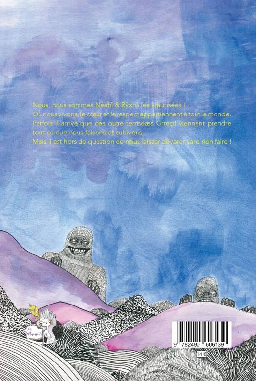 Nous, nous sommes Nêxhï & Rÿxhâ les soeurisées ! Où nous vivons, le coeur et le respect appartiennent à tout le monde. Parfois il arrive que des outre-terriséæs Grreçif viennent prendre tout ce que nous faisons et cultivons. Mais il est hors de question de nous laisser dévorer sans rien faire ! Cet ouvrage permet aux enfants (et adultes) de découvrir une autre façon de partager le monde, sans être dans l'accaparement ni la naïveté. Une société horizontale avec une singulière façon de résoudre conflits et désaccords, la danse. Bien sûr quand surgissent des outre-terriséæs Grreçif, cela change la donne.