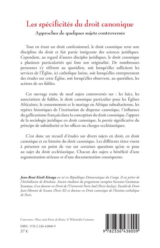 Tout en étant un droit confessionnel, le droit canonique reste une discipline du droit et fait partie intégrante des sciences juridiques. Cependant, au regard d'autres disciples juridiques, le droit canonique a plusieurs particularités qui font son originalité. De nombreuses personnes s'y réfèrent au quotidien, soit lorsqu'elles sollicitent les services de l'Église, ici catholique latine, soit lorsqu'elles entreprennent des études sur cette Église, soit lorsqu'elles observent, au quotidien, les actions de ses fidèles. Cet ouvrage traite de neuf sujets controversés sur: les laïcs, les associations de fidèles, le droit canonique particulier pour les Églises Africaines, le consentement et le mariage en Afrique subsaharienne, les repères historiques de l'institution de dispense canonique, l'influence du gallicanisme français dans la conception du droit canonique, l'apport de la sociologie juridique en droit canonique, la portée significative du principe de subsidiarité et les offices ou charges ecclésiastiques.