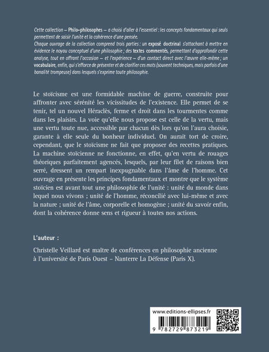 effet, qu’en vertu de rouages théoriques parfaitement agencés, lesquels, par leur filet de raisons bien serré, dressent un rempart inexpugnable dans l’âme de l’homme. Cet ouvrage en présente les principes fondamentaux et montre que le système stoïcien est avant tout une philosophie de l’unité : unité du monde dans lequel nous vivons ; unité de l’homme, réconcilié avec lui-même et avec la nature ; unité de l’âme, corporelle et homogène ; unité du savoir enfin, dont la cohérence donne sens et rigueur à toutes nos actions.