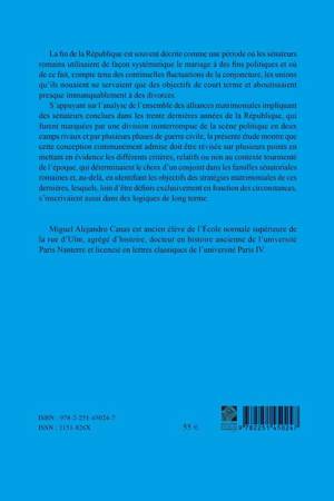 La fin de la Republique est souvent decrite comme une periode ou les senateurs romains utilisaient de facon systematique le mariage a des fins politiques et ou de ce fait, compte tenu des continuelles fluctuations de la conjoncture, les unions qu'ils nouaient ne servaient que des objectifs de court terme et aboutissaient presque immanquablement a des divorces.S'appuyant sur l'analyse de l'ensemble des alliances matrimoniales impliquant des senateurs conclues dans les trente dernieres annees de la Republique, qui furent marquees par une division ininterrompue de la scene politique en deux camps rivaux et par plusieurs phases de guerre civile, la presente etude montre que cette conception communement admise doit etre revisee sur plusieurs points en mettant en evidence les differents criteres, relatifs ou non au contexte tourmente de l'epoque, qui determinaient le choix d'un conjoint dans les familles senatoriales romaines et, au-dela, en identifiant les objectifs des strategies matrimoniales de ces dernieres, lesquels, loin d'etre definis exclusivement en fonction des circonstances, s'inscrivaient aussi dans des logiques de long terme.
