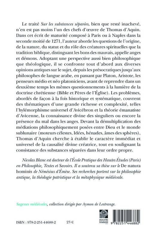 Le traité Sur les substances séparées, bien que resté inachevé, n’en est pas moins l’un des chefs d’œuvre de Thomas d’Aquin. Dans cet écrit de maturité composé à Paris ou à Naples dans la seconde moitié de 1271, l’auteur aborde les questions de l’origine, de la nature, du statut et du rôle des créatures spirituelles que la tradition biblique, distinguant les bons des mauvais, appelle anges et démons. Adoptant une perspective aussi bien philosophique que théologique, il se confronte tout d’abord aux diverses opinions antiques sur le sujet, depuis les présocratiques jusqu’aux philosophes de langue arabe, en passant par Platon, Aristote, les penseurs médio et néo platoniciens, avant de reprendre dans un deuxième temps les mêmes questionnements à la lumière de la doctrine chrétienne (Bible et Pères de l’Église). Les problèmes, abordés de façon à la fois historique et systématique, couvrent des thématiques d’une grande richesse et complexité, telles l’hylémorphisme universel d’Avicébron et la théorie émanatiste d’Avicenne, la connaissance divine des singuliers ou encore la présence du mal dans les anges. Devant la démultiplication des médiations philosophiquement posées entre Dieu et le monde sublunaire (moteurs célestes, Idées, hénades, âmes des sphères), Thomas d’Aquin cherche à établir le caractère immédiat et universel de la causalité divine créatrice, tout en soulignant la consistance des substances séparées dans leur ordre propre.