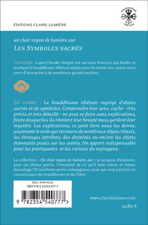 Le bouddhisme tibétain regorge d’objets sacrés et de symboles. Comprendre leur sens caché – très précis et très détaillé – ne peut se faire sans explications, faute desquelles ils révèlent leur beauté mais gardent leur mystère. Les explications, ce petit livre nous les donne, soulevant le voile qui recouvre de nombreux ustensiles rituels, les étranges attributs des divinités ou encore les objets étonnants posés sur les autels. Un apport indispensable pour les pratiquants et les curieux du Vajrayana.