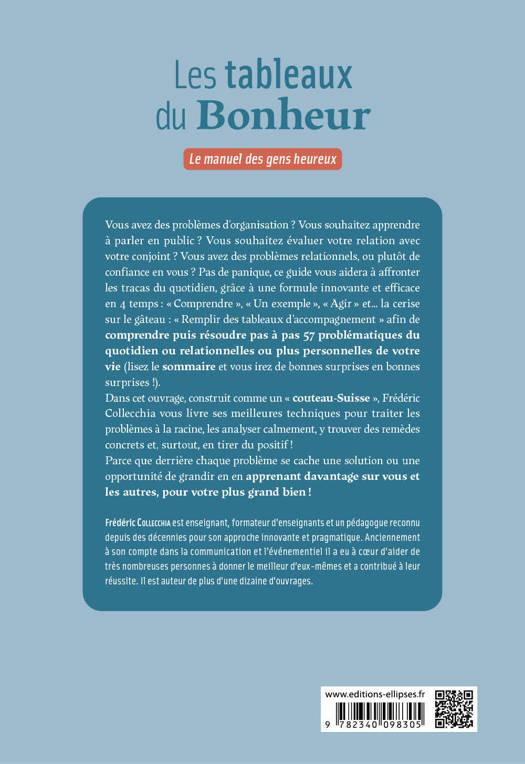 Dans cet ouvrage, construit comme un « couteau-Suisse », Frédéric Collecchia vous livre ses meilleures techniques pour traiter les problèmes à la racine, les analyser calmement, y trouver des remèdes concrets et, surtout, en tirer du positif !