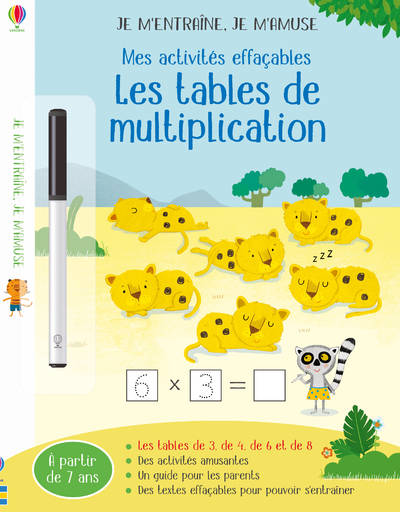 Le feutre fourni avec le cahier permet d'écrire facilement sur les pages nettoyables, avant de tout effacer et de recommencer. Les enfants pourront ainsi s'entraîner en compagnie de charmants animaux de la jungle à faire de simples multiplications sous forme de jeux, se familiariser avec les tables de 3, 4 et 6 et acquérir de façon ludique des notions essentielles.