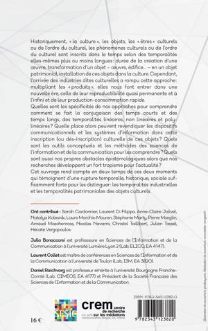 Historiquement, "la culture", les objets, les "êtres" culturels, les phénomènes culturels sont inscrits dans le temps selon des temporalités plus ou moins longues : durée de la création d'une uvre, transformation d'un objet en un objet patrimonial, installation des objets dans la culture. L'arrivée des industries dites culturelles a rompu cette approche : multipliant les "produits", elles nous font entrer dans l'ère de leur reproductibilité et de leur production-consommation rapide. Quelles sont les spécificités de nos approches pour comprendre comment se fait la conjugaison des temps courts et des temps longs, des temporalités linéaires, non linéaires et polylinéaires des temporalités industrielles et des temporalités patrimoniales des objets culturels ?