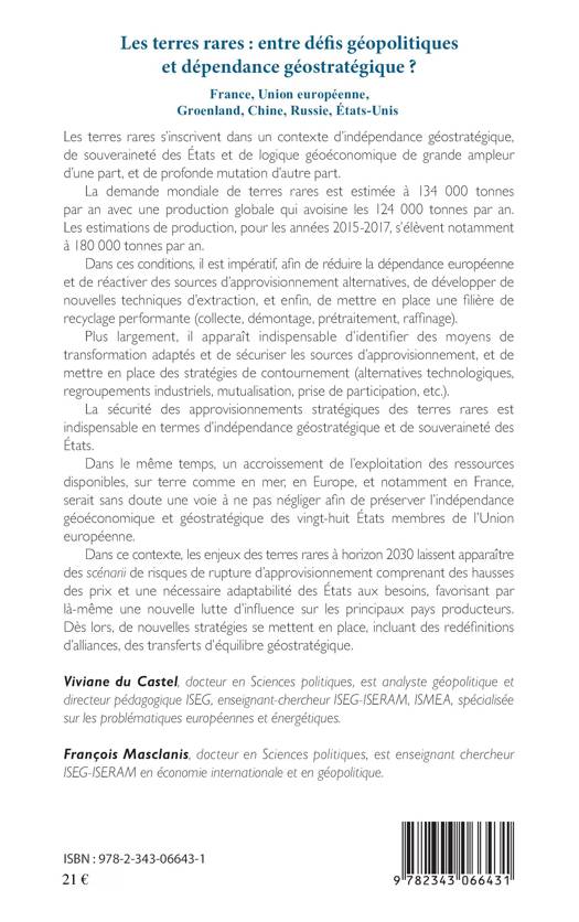 La demande mondiale de terres rares étant importante, cet ouvrage constate la nécessité de réduire la dépendance européenne et propose différentes solutions. Pour l'auteur, les enjeux des terres rares à l'horizon 2030 laissent apparaitre des scénarii de risques de rupture d'approvisionnement comprenant des hausses des prix et une nécessaire adaptabilité des états, favorisant une nouvelle lutte d'influence sur les principaux pays producteurs. De nouvelles stratégies se mettent donc en place.