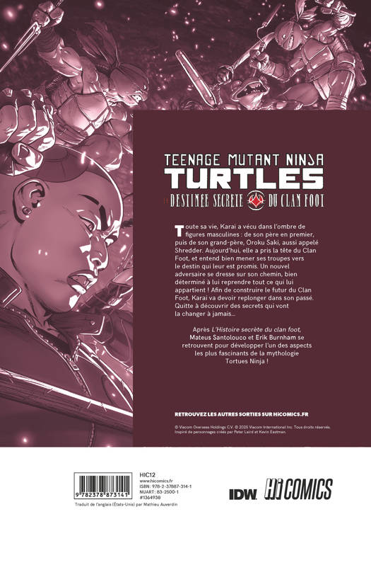 Après avoir brillamment exploré le passé des plus grands ennemis des Tortues Ninja dans L'Histoire Secrète du clan Foot, Erik Burnham (au scénario)et le brillant Mateus Santolouco (au dessin)se retrouvent pour lever des zones d'ombres et tisser le futur des Foot. Une histoire incontournable pour les fans des Tortues et de leur mythologie.