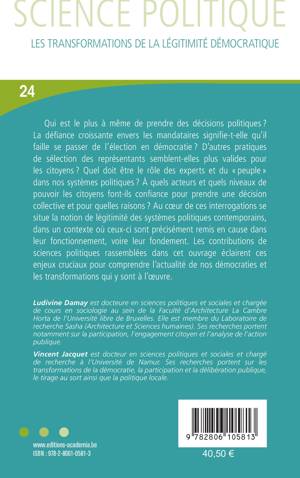 Qui est le plus à même de prendre des décisions politiques ? Quel doit être le rôle des élus, des experts et du peuple en démocratie ? À quels acteurs, processus et niveaux de pouvoir les citoyens font-ils davantage confiance ? Au coeur de ces interrogations se niche le concept de légitimité qui mérite d'autant plus d'être questionné que nos démocraties sont sous tensions. Cet ouvrage collectif de sciences politiques et sociales ambitionne d'aider à comprendre l'actualité de nos démocraties.