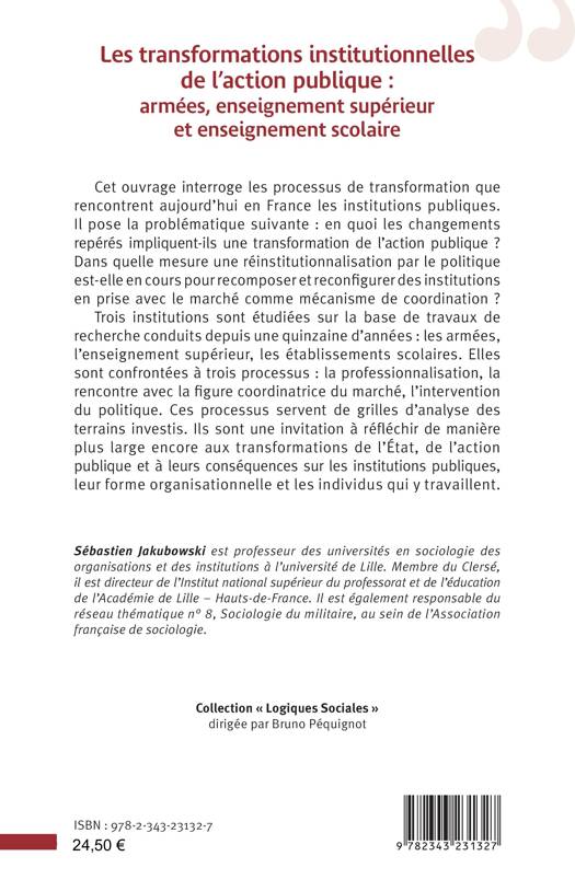 Cet ouvrage interroge les processus de transformation que rencontrent aujourd’hui en France les institutions publiques. En quoi les changements repérés impliquent-ils une transformation de l’action publique ? Dans quelle mesure une réinstitutionnalisation par le politique est-elle en cours pour recomposer et reconfigurer des institutions en prise avec le marché comme mécanisme de coordination ? Trois institutions sont étudiées sur la base de travaux de recherche conduits depuis une quinzaine d’années : les armées, l’enseignement supérieur, les établissements scolaires. Elles sont confrontées à trois processus : la professionnalisation, la rencontre avec la figure coordinatrice du marché, l’intervention du politique. Ces processus servent de grilles d’analyse. Ils sont une invitation à réfléchir de manière plus large aux transformations de l’État, de l’action publique et à leurs conséquences sur les institutions publiques, leur forme organisationnelle et les individus qui y travaillent.
