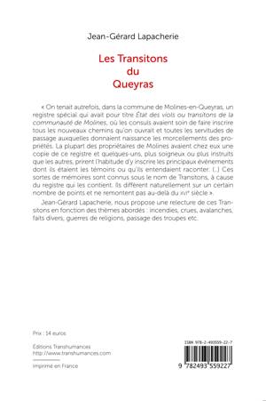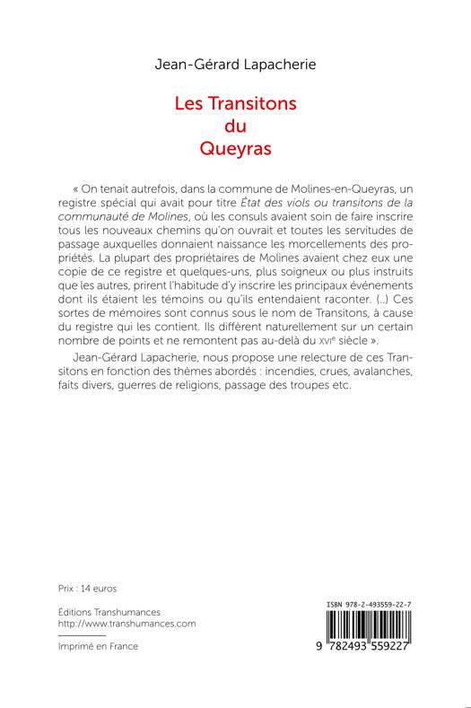 « On tenait autrefois, dans la commune de Molines-en-Queyras, un registre spécial qui avait pour titre État des viols ou transitons de la communauté de Molines, où les consuls avaient soin de faire inscrire tous les nouveaux chemins qu’on ouvrait et toutes les servitudes de passage auxquelles donnaient naissance les morcellements des propriétés. La plupart des propriétaires de Molines avaient chez eux une copie de ce registre et quelques-uns, plus soigneux ou plus instruits que les autres, prirent l’habitude d’y inscrire les principaux événements dont ils étaient les témoins ou qu’ils entendaient raconter. (..) Ces sortes de mémoires sont connus sous le nom de Transitons, à cause du registre qui les contient. Ils diffèrent naturellement sur un certain nombre de points et ne remontent pas au-delà du XVIe siècle ». Jean-Gérard Lapacherie, nous propose une relecture de ces Transitons en fonction des thèmes abordés : incendies, crues, avalanches, faits divers, guerres de religions, passage des troupes etc.