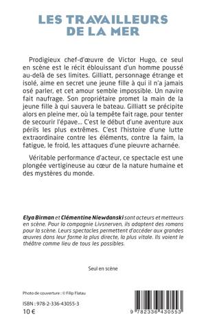 Prodigieux chef-d'oeuvre de Victor Hugo, ce seul en scène est le récit éblouissant d'un homme poussé au-delà de ses limites. Gilliatt, personnage étrange et isolé, aime en secret une jeune fille à qui il n'a jamais osé parler, et cet amour semble impossible. Un navire fait naufrage. Son propriétaire promet la main de la jeune fille à qui sauvera le bateau. Gilliatt se précipite alors en pleine mer, où la tempête fait rage, pour tenter de secourir l'épave... C'est le début d'une aventure aux périls les plus extrêmes. C'est l'histoire d'une lutte extraordinaire contre les éléments, contre la faim, la fatigue, le froid, les attaques d'une pieuvre acharnée. Véritable performance d'acteur, ce spectacle est une plongée vertigineuse au coeur de la nature humaine et des mystères du monde. Seul en scène