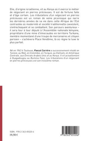 Elie, d'origine Israélienne, vit au Kenya où il exerce le métier de négociant en pierres précieuses. Il est de fortune faite et d'âge certain. Les tribulations d'un négociant en pierres précieuses est un roman de veine picaresque qui narre les dernières années de sa vie dans cette Afrique de l'Est contrastée où modernité et société traditionnelle coexistent, s'entrechoquent et se combattent.