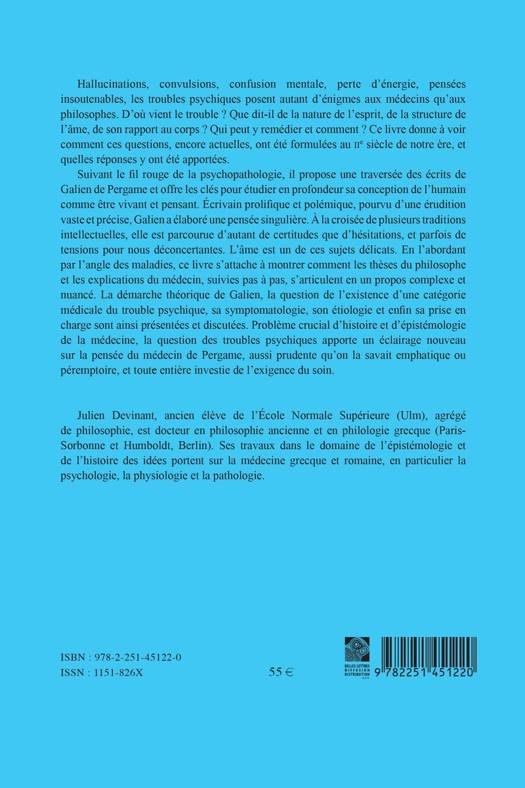 Hallucinations, convulsions, confusion mentale, perte d'energie, pensees insoutenables, les troubles psychiques posent autant d'enigmes aux medecins qu'aux philosophes. D'ou vient le trouble ? Que dit-il de la nature de l'esprit, de la structure de l'ame, de son rapport au corps ? Qui peut y remedier et comment ? Ce livre donne a voir comment ces questions, encore actuelles, ont ete formulees au IIe siecle de notre ere, et quelles reponses y ont ete apportees. Suivant le fil rouge de la psychopathologie, il propose une traversee des ecrits de Galien de Pergame et offre les cles pour etudier en profondeur sa conception de l'humain comme etre vivant et pensant. Ecrivain prolifique et polemique, pourvu d'une erudition vaste et precise, Galien a elabore une pensee singuliere. A la croisee de plusieurs traditions intellectuelles, elle est parcourue d'autant de certitudes que d'hesitations, et parfois de tensions pour nous deconcertantes. L'ame est un de ces sujets delicats. En l'abordant par l'angle des maladies, ce livre s'attache a montrer comment les theses du philosophe et les explications du medecin, suivies pas a pas, s'articulent en un propos complexe et nuance. La demarche theorique de Galien, la question de l'existence d'une categorie medicale du trouble psychique, sa symptomatologie, son etiologie et enfin sa prise en charge sont ainsi presentees et discutees. Probleme crucial d'histoire et d'epistemologie de la medecine, la question des troubles psychiques apporte un eclairage nouveau sur la pensee du medecin de Pergame, aussi prudente qu'on la savait emphatique ou peremptoire, et toute entiere investie de l'exigence du soin.