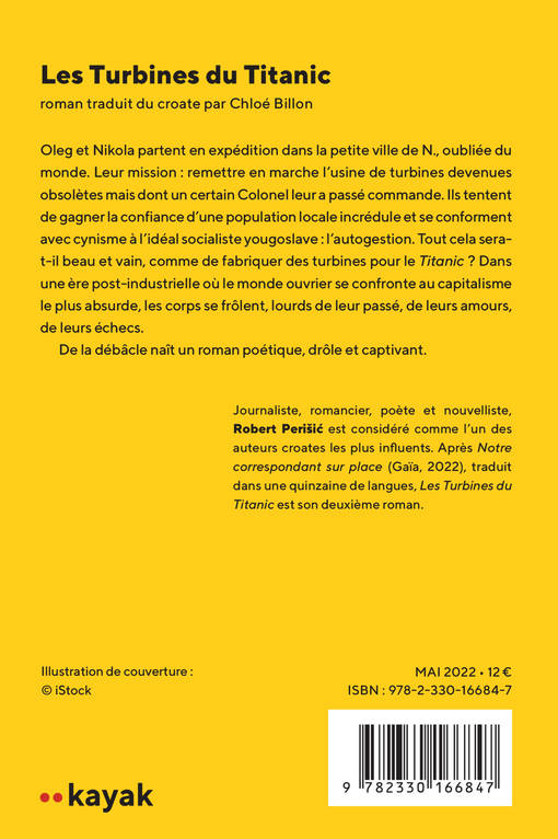 Oleg et Nikola partent en expédition dans la petite ville de N., oubliée du monde. Leur mission : remettre en marche l'usine de turbines devenues obsolètes mais dont un certain Colonel leur a passé commande. Ils tentent de gagner la confiance d'une population locale incrédule et se conforment avec cynisme à l'idéal socialiste yougoslave : l'autogestion. Tout cela sera-t-il beau et vain, comme de fabriquer des turbines pour le Titanic ? Dans une ère post-industrielle où le monde ouvrier se confronte au capitalisme le plus absurde, les corps se frôlent, lourds de leur passé, de leurs amours, de leurs échecs. De la débâcle naît un roman poétique, drôle et captivant.