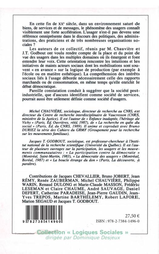 En cette fin de XXe siècle, dans un environnement saturé de biens, de services et de messages, le phénomène des usagers connaît visiblement une forte accélération. L'usager n'est-il pas devenu une référence omniprésente dans le discours des politiques, des administrations, des praticiens et de très nombreuses organisations sociales ? Les auteurs de ce collectif, réunis par M. Chauvière et J.T. Godbout ont voulu rendre compte de la place et du point de vue des usagers dans les multiples domaines où ils émergent et font entendre leur voix. Cette orientation rencontre les intuitions et les initiatives de maints acteurs sociaux dans les mobilisations sont souvent "en avance" sur la logique de production (par exemple à l'école ou en matière esthétique). La compréhension des intérêts sociaux liés à l'usage déborde nécessairement celle des rapports marchands ou de consommation, en même temps qu'elle enrichit le débat démocratique. Pareille constatation conduit à suggérer que la société post-industrielle, que d'aucuns identifient comme société de services, pourrait aussi être utilement définie comme société d'usagers.