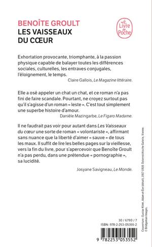 Il ne faudrait pas voir pour autant dans Les Vaisseaux du coeur une sorte de roman « volontariste », affirmant sans nuance que la liberté d'aimer « sauve » de tous les maux. Il suffit de lire les belles pages sur la vieillesse, vers la fin du livre, pour s'apercevoir que Benoîte Groult n'a pas perdu, dans une prétendue « pornographie », sa lucidité.