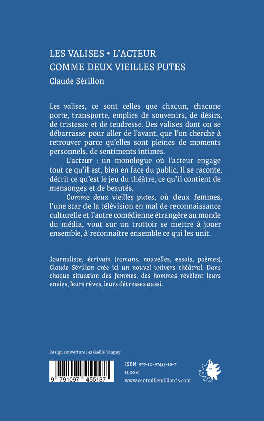 Les valises, ce sont celles que chacun, chacune porte, transporte, emplies de souvenirs, de désirs, de tristesse et de tendresse. Des valises dont on se débarrasse pour aller de l'avant, que l’on cherche à retrouver parce qu’elles sont pleines de moments personnels, de sentiments intimes. L’acteur : un monologue où l’acteur engage tout ce qu’il est bien en face du public. Il se raconte, raconte ce qu’est le jeu du théâtre, ce qu’il contient de mensonges et de beautés. Comme deux vieilles putes, où deux femmes, l’une star de la télévision en mal de reconnaissance culturelle et l’autre comédienne étrangère au monde du média, vont sur un trottoir se mettre à jouer ensemble, à reconnaître ensemble ce qui les unit.